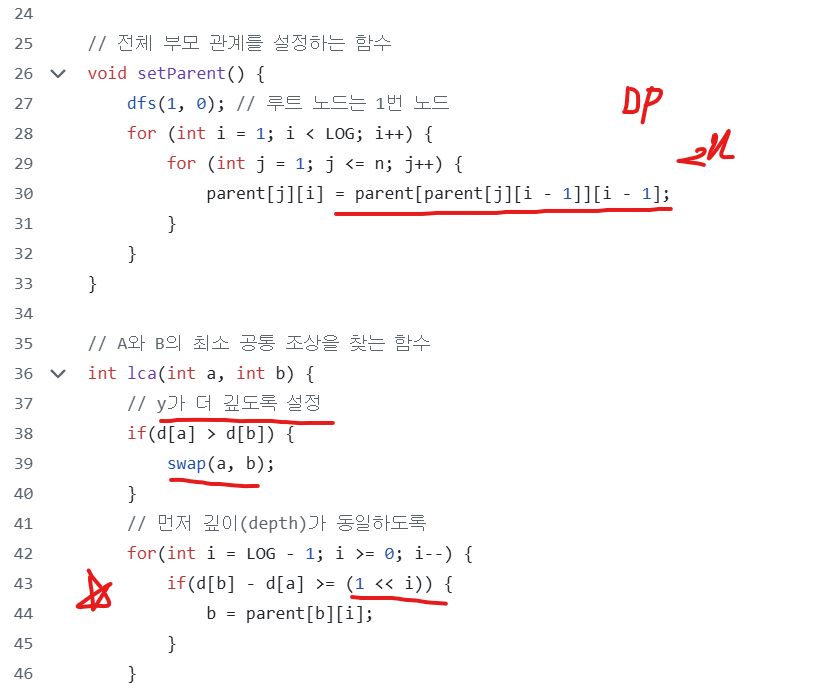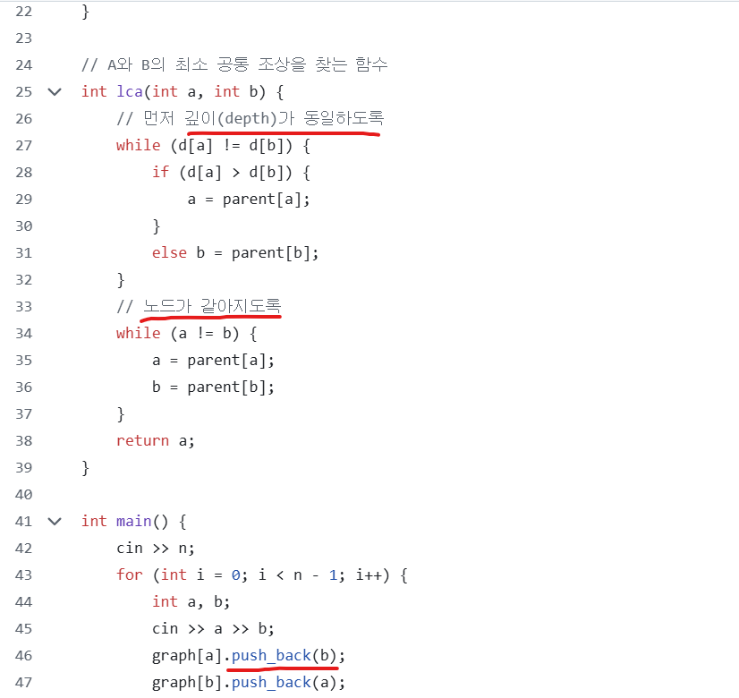 lca 함수에서 먼저, 항상 b가 더 깊도록 swap을 진행한다