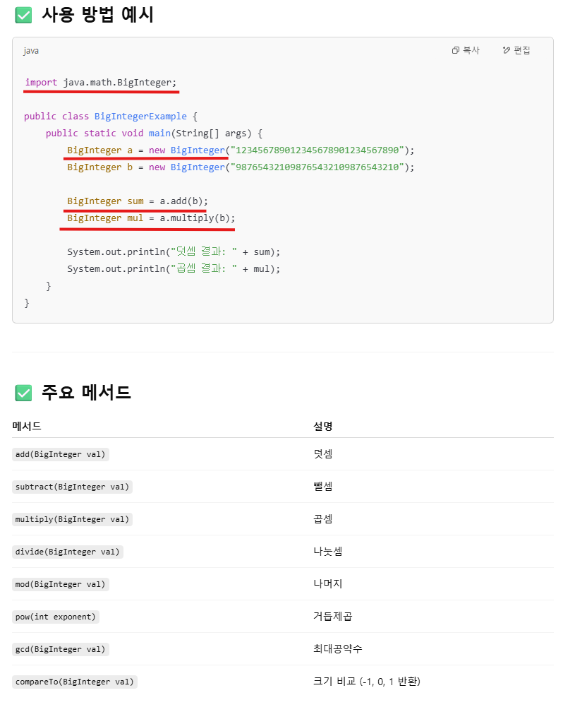 BigInteger는 자바에서 아주 큰 정수(long보다 큰 값)를 다루기 위해 사용하는 클래스입니다.