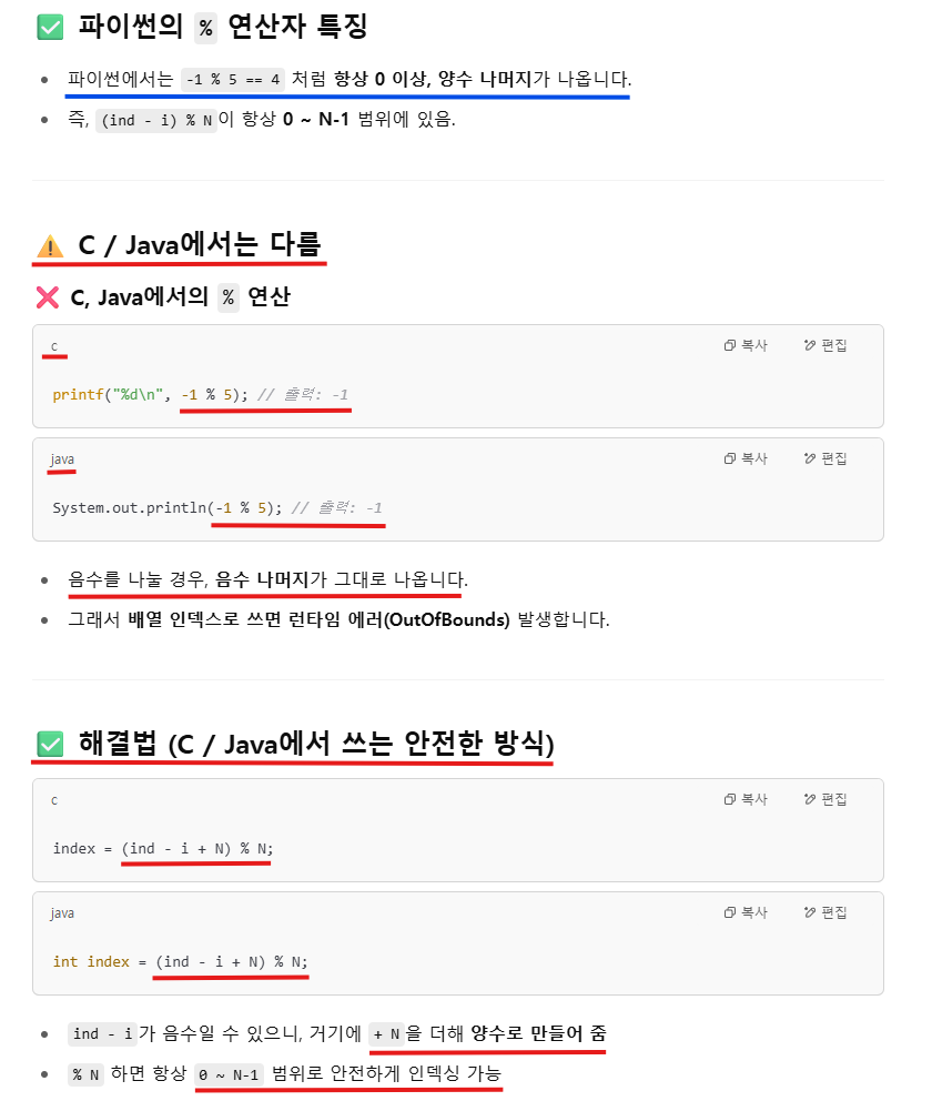 뒤에 N을 추가로 더해준다 : ( ind - i + N ) % N