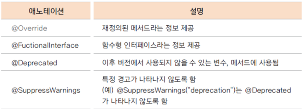 애노테이션(annotation : 주석) : 컴파일러에게 특별한 정보를 제공해주는 역할을 한다.