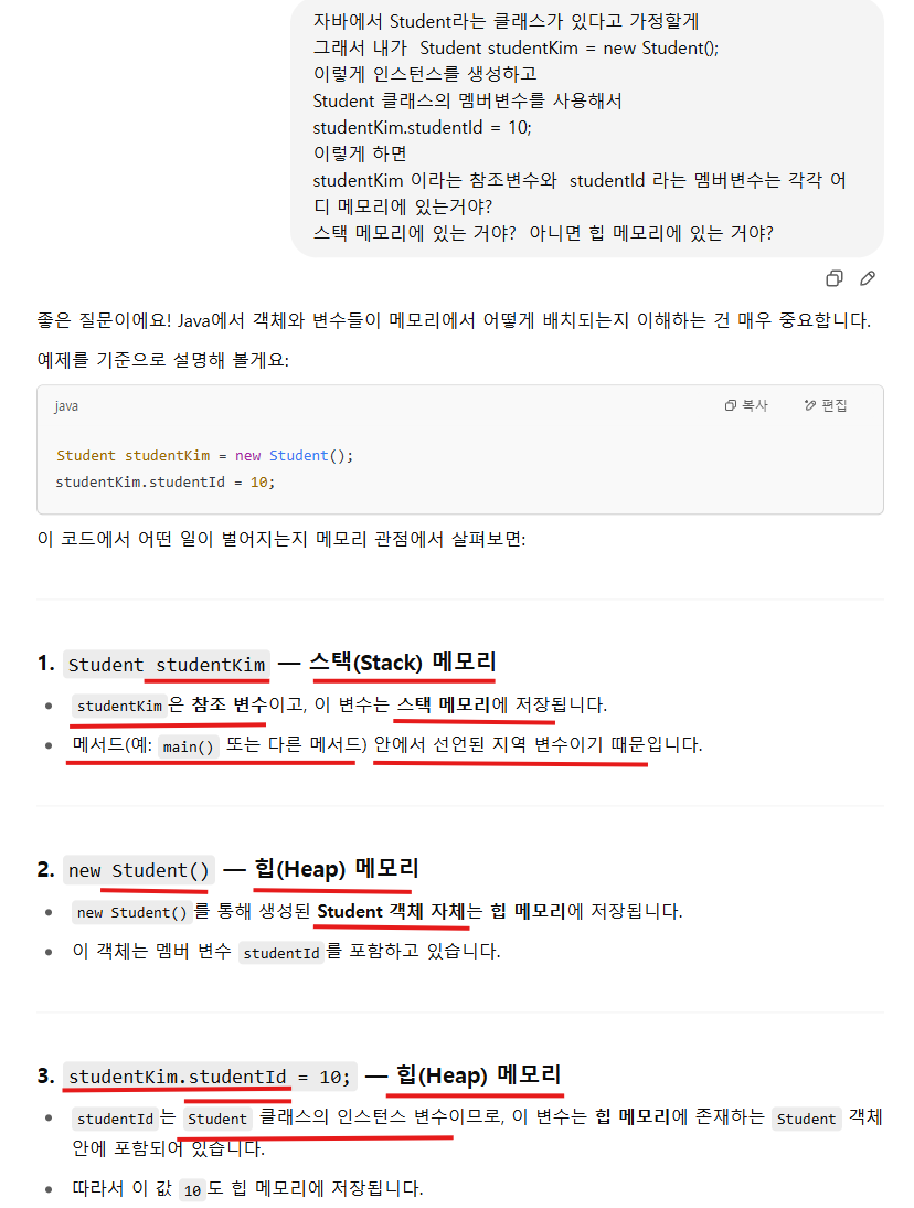 studentKim : 참조변수 --> 스택 메모리 : 메서드( main함수 or 기타 메서드) 안에서 선언된 지역 변수이기 때문이다.