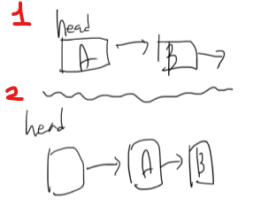 연결리스트는 보통 (1번) head가 시작노드인 경우와 , (2) head포인터를 사용해서 head 다음부터 시작노드인 경우가 있는데