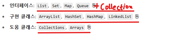 - 프로그램 구현에 필요한 자료구조(Data Structure)를 구현해 놓은 JDK 라이브러리