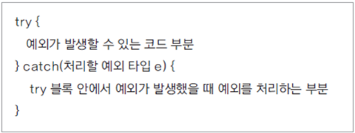 - try 블록에는 예외가 발생할 가능성이 있는 코드를 작성하고 try 블록 안에서 예외가 발생하는 경우 catch 블록이 수행됨