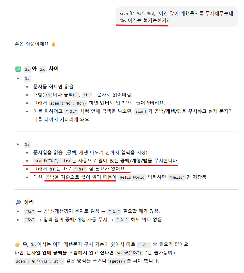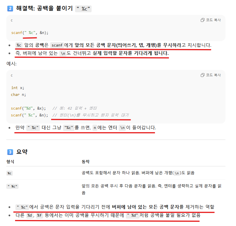 들판속초록풀 2025. 9. 3. 12:26%c 앞의 공백은 scanf에게 앞의 모든 공백 문자(띄어쓰기, 탭, 개행)를 무시하라고 지시합니다.