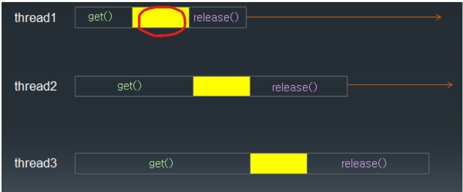 - 한 순간 오직 하나의 thread 만이 semaphore를 얻을 수 있고, 나머지 thread들은 대기(blocking) 상태가 된다.