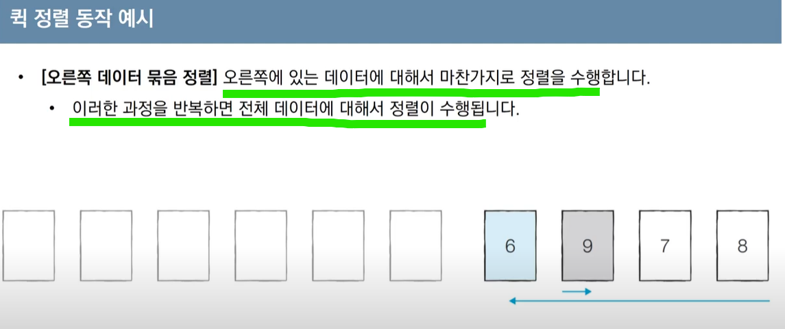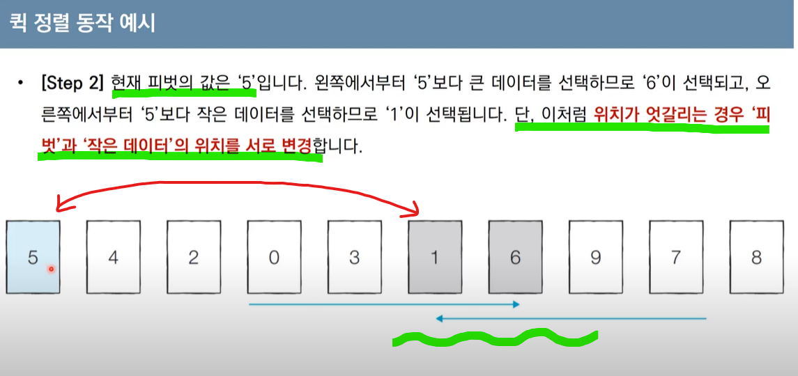 아주 중요!!! : 위치가 엇갈릴 때는 '피벗'과 '작은 데이터'의 위치를 서로 변경한다.