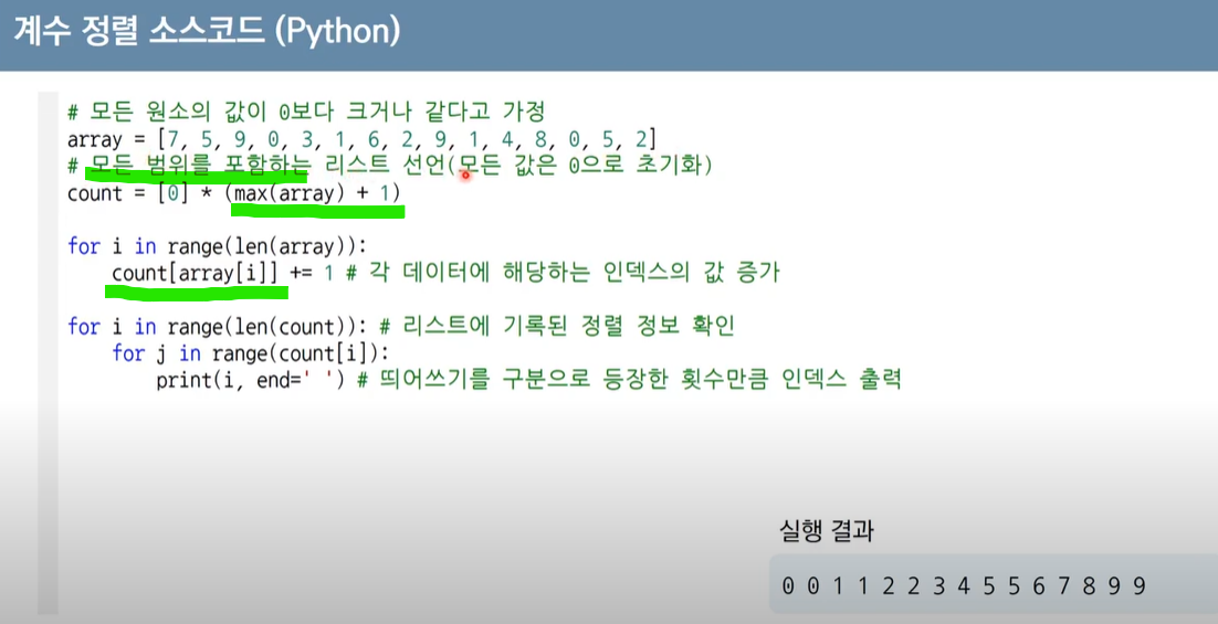 계수 정렬은 가장 작은 데이터부터 가장 큰 데이터까지의 범위가 모두 담길 수 있는 크기의 리스트를 선언해야 한다