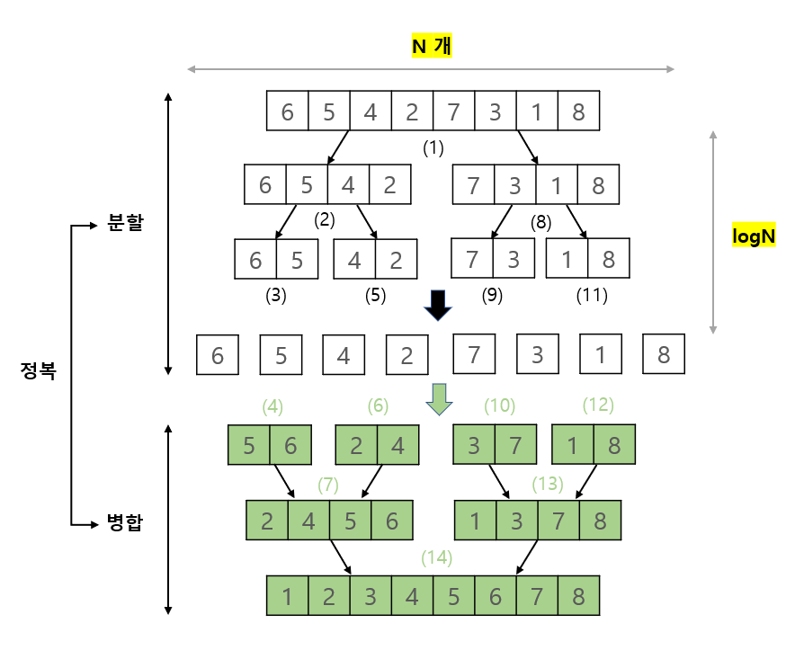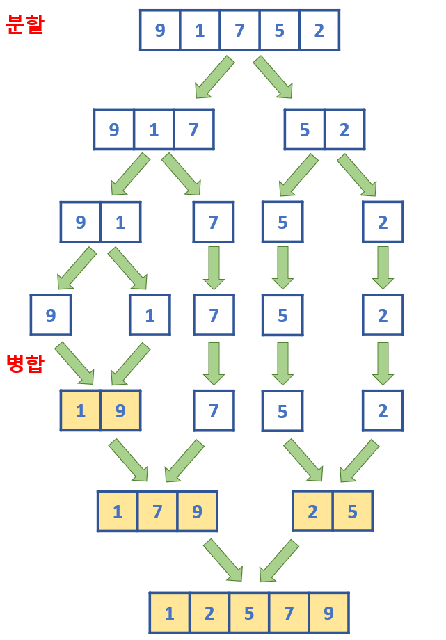 병합정렬은 데이터를 가장 작은 단위까지 분할한 다음 정렬하면서 다시 병합하는 알고리즘이다.