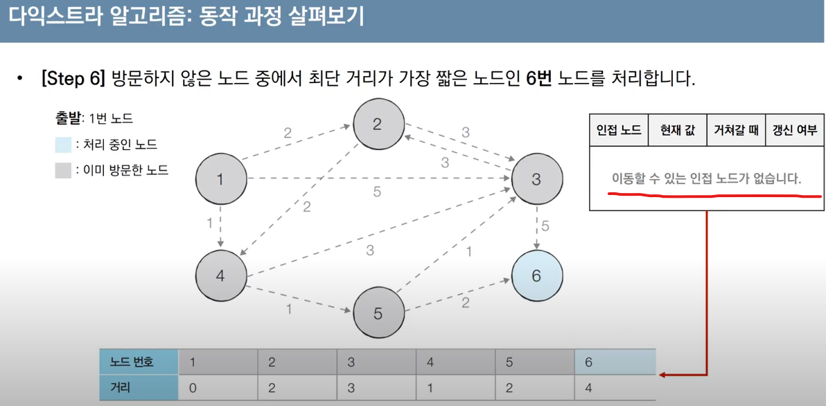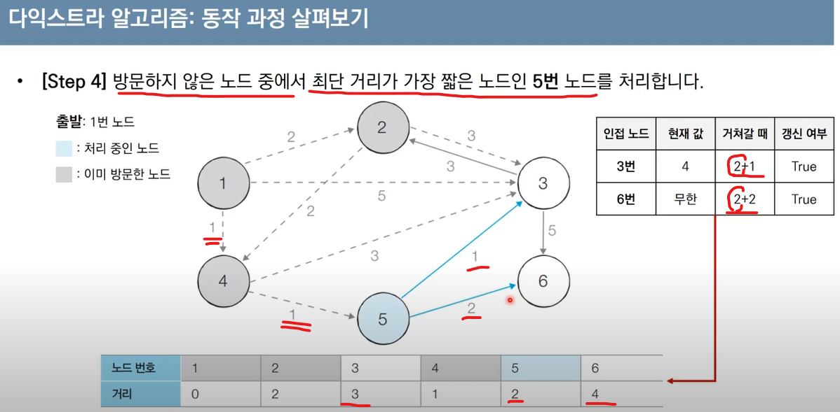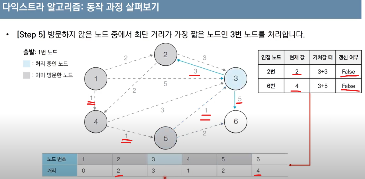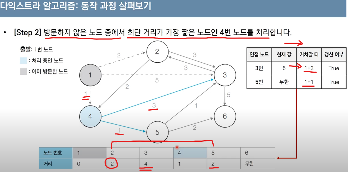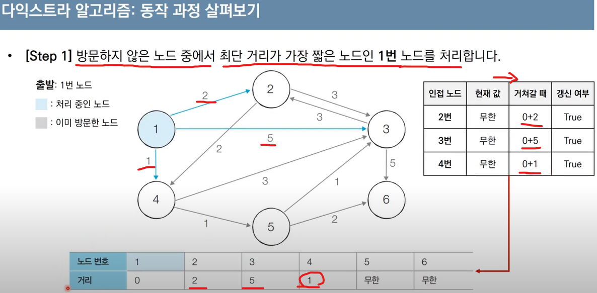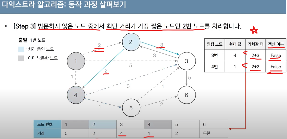 1번 노드에서 2번 노드를 방문했을 경우에는 현재 값보다 2를 거쳐갔을 때 값이 더 크므로(거리가 더 머니까) 갱신하지 않는다