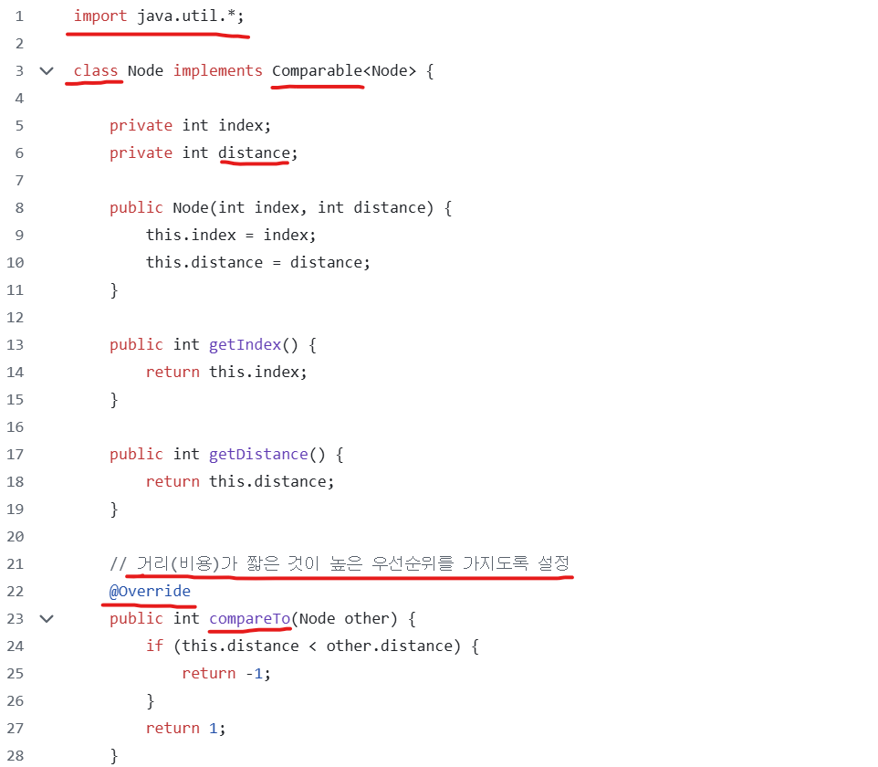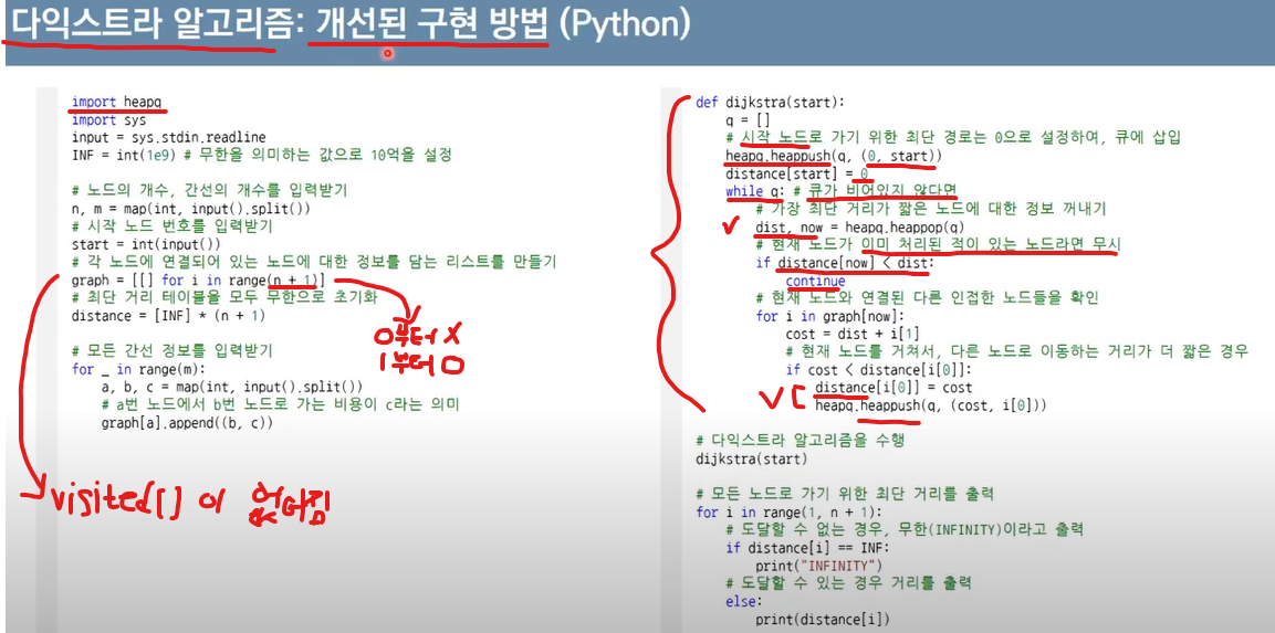그리고 방문처리하는 배열을 따로 만들지 않고 최단거리 테이블과 비교해서 현재 노드 거리값보다