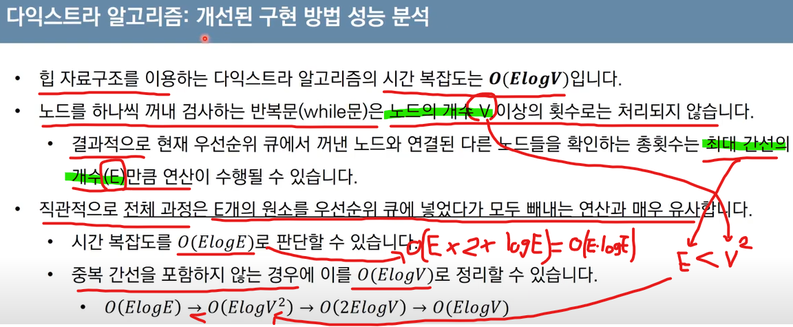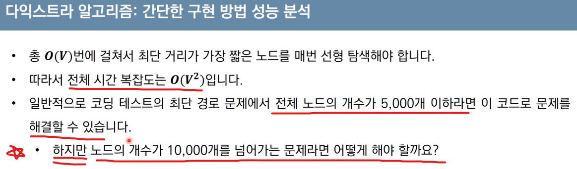 O(V) 번에 걸쳐서 최단 거리가 가장 짧은 노드를 찾기 위해 O(V) 번 선형 탐색을 해야 하므로