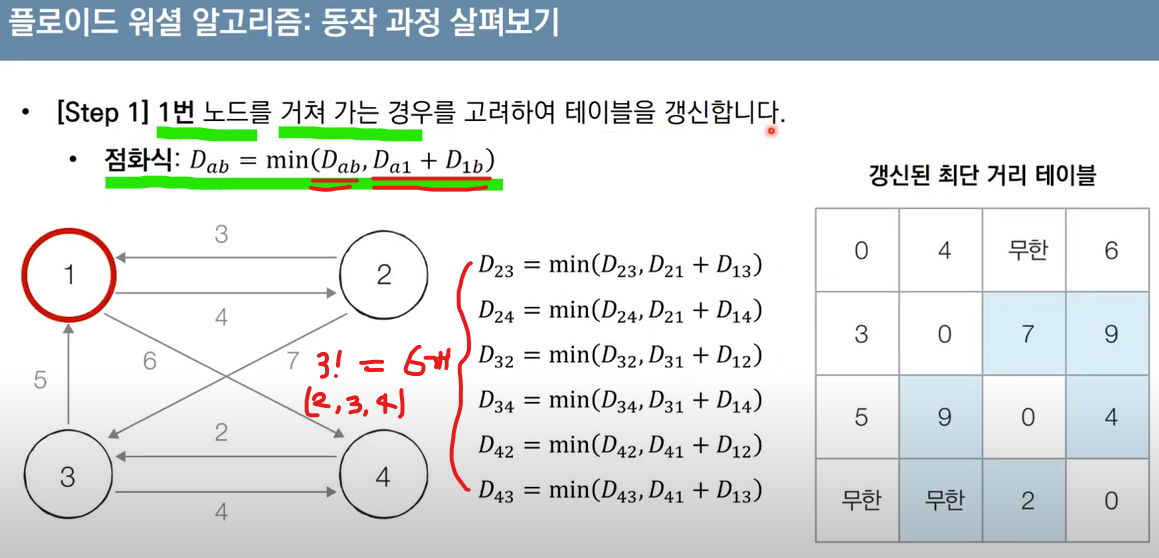 플로이드 워셜 알고리즘은 다이나믹 프로그래밍 유형에 속한다는 점에서 점화식에 맞게
