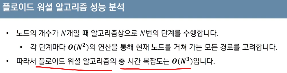 3중 반복문을 이용하기 때문에 시간복잡도가 O(N^^3) 이기에 노드의 개수가 적은 상황에서 효과적으로 사용할 수 있고