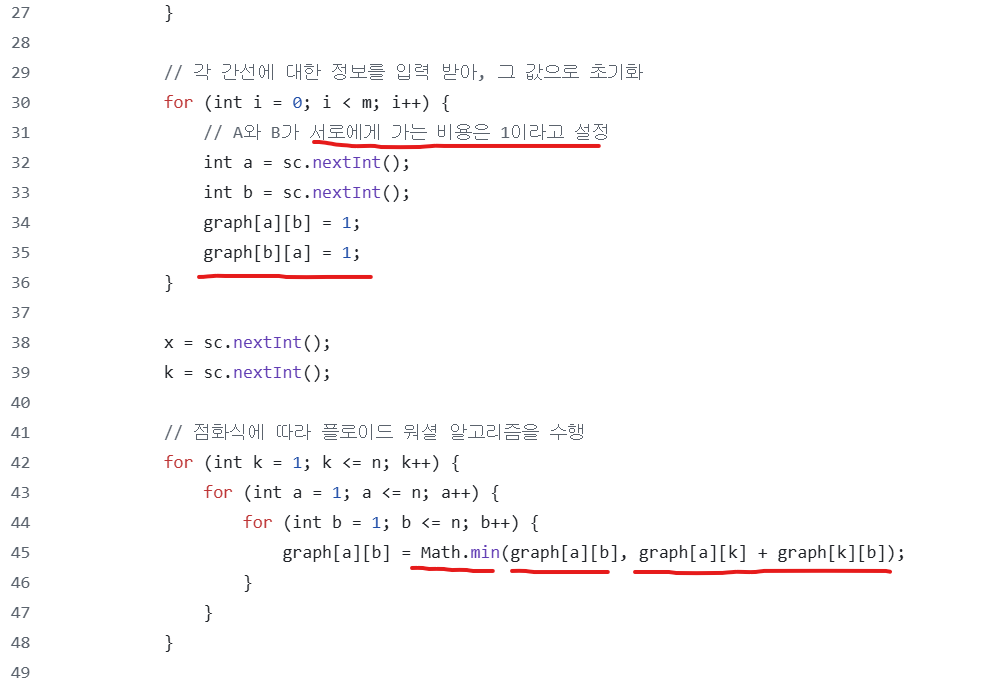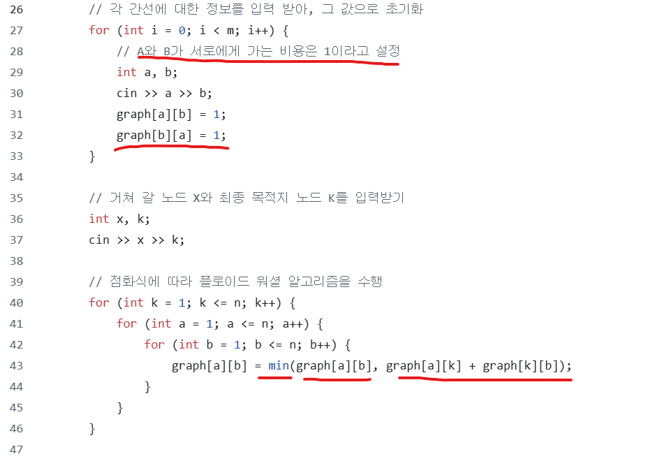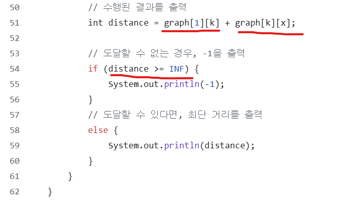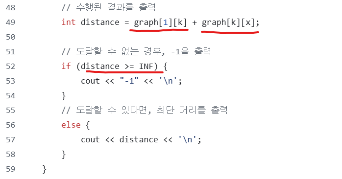 (1번 -- X 최단 거리 + X -- K 최단 거리) 를 계산하면 된다