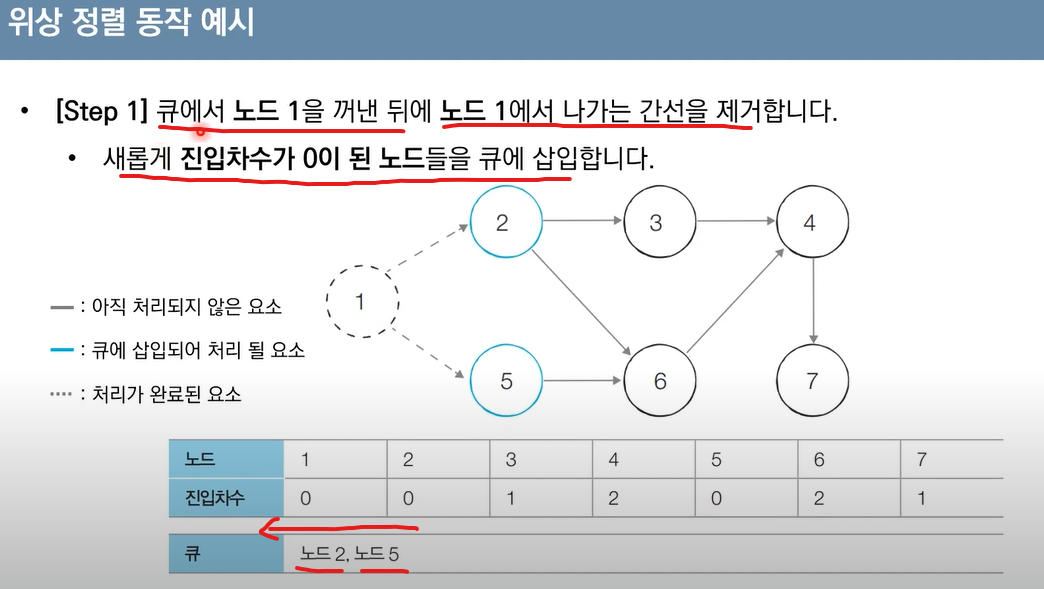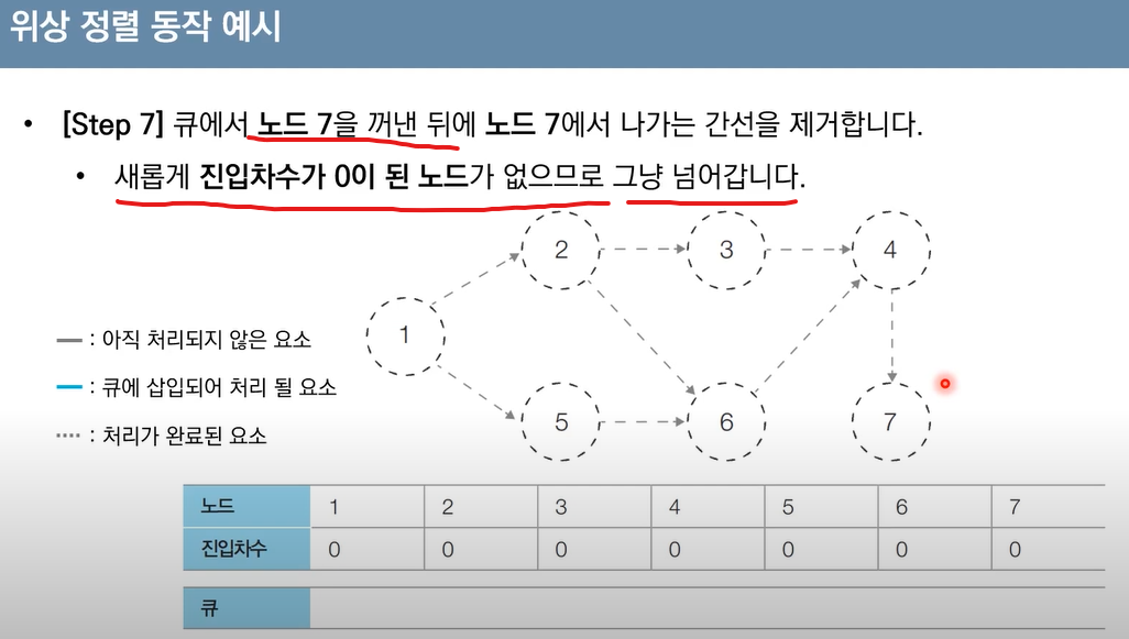 사이클이 존재하는 방향 그래프라면 사이클에 포함되어 있는 모든 노드는 진입 차수가 1이상이기에