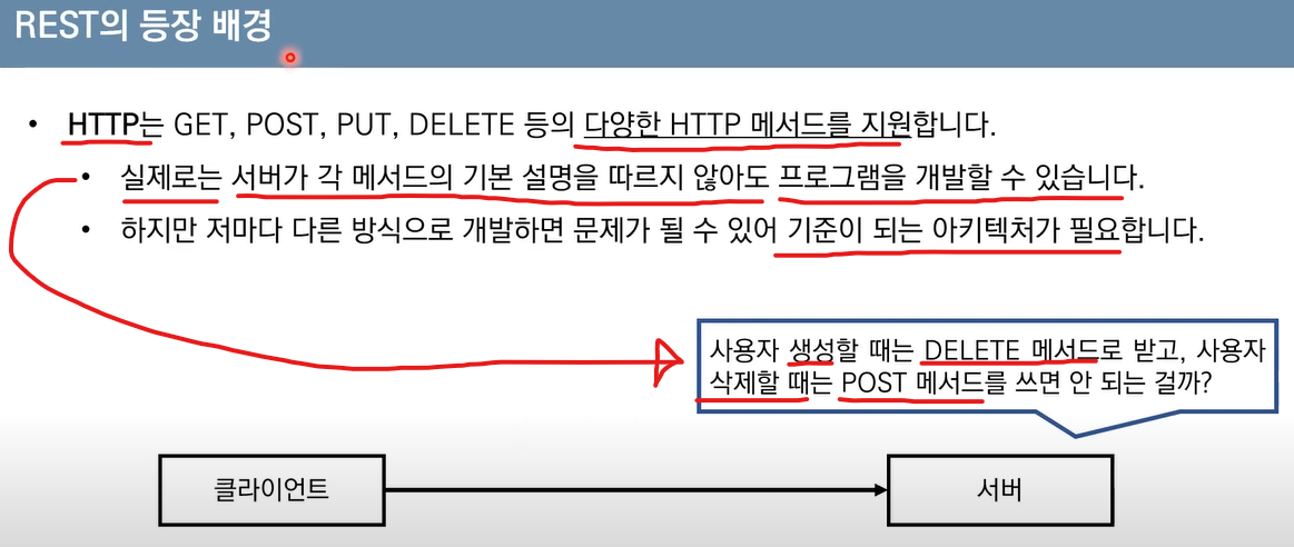 클라이언트와 서버가 밑에와 같이 자원, 행위, 표현을 포함한 형태로 데이터를 주고 받자고 약속하고 사용하는 것이 REST 이다