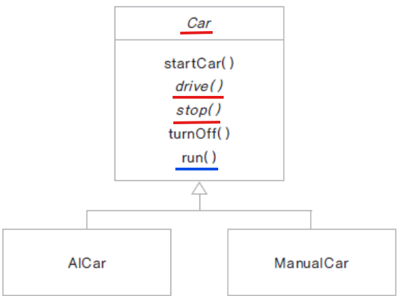 public abstract void drive(); // 추상 메서드 선언 (하위 클래스에서 반드시 구현 해야 함)