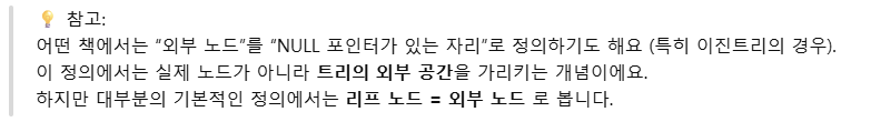 근데 어떤 문제에서는 키, 요소 없는 null 더미 노드들을 외부노드로 보는 문제도 있다. (이진탐색트리 실습문제 1번)