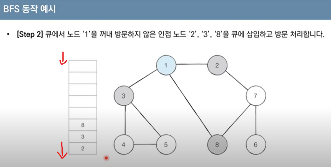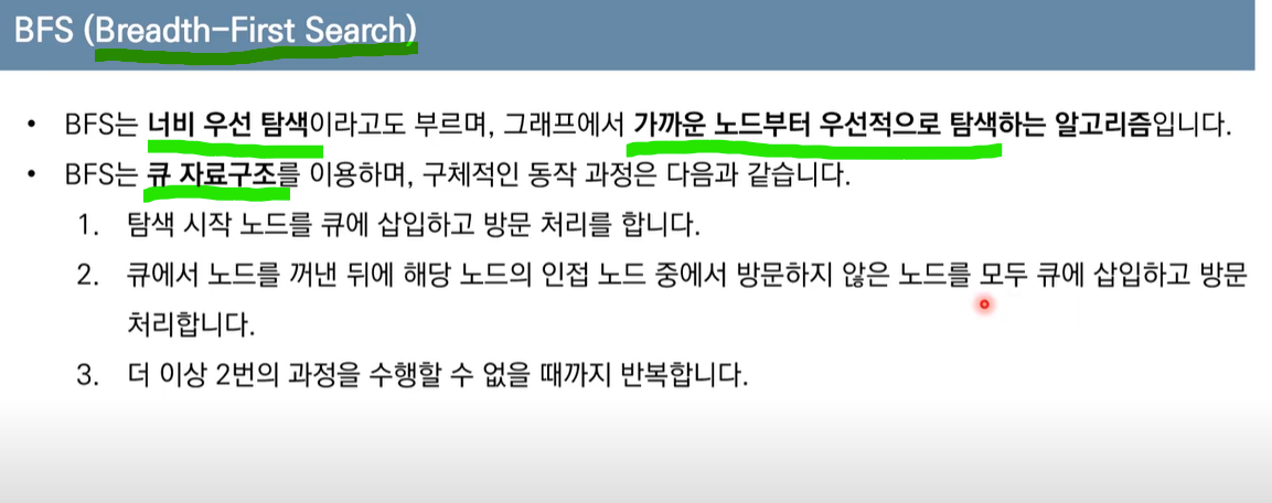 BFS (Breadth-First-Search) : 너비 우선 탐색 , 그래프에서 가까운 부분을 우선적으로 탐색하는 알고리즘 , 그래프 탐색