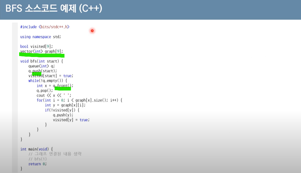 BFS 코드 예제 : DFS 와 마찬가지로 BFS 도 0번 인덱스를 비워두고, visited 배열의 요소를 9개로 선언한다