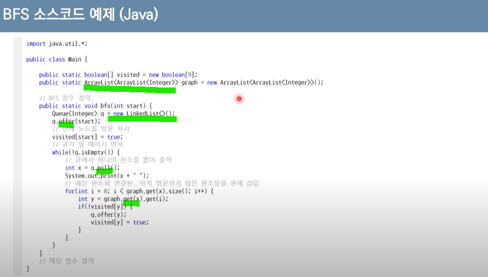 public static void bfs(int start) { // 인스턴스 생성해서 호출하지 않고 static인 main메서드에서 바로 사용 가능하게 static으로 선언함
